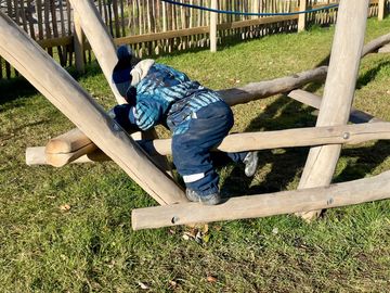Nach der dritten Stunde ist es Zeit für frische Luft und Bewegung. 15 Minuten dauert die "Bewegungspause" auf der großen, grünen Wiese. Die Spielgeräte werden gerne genutzt und auch in den mobilen Wäschekörben gibt es immer wieder neue Pausenangebote.