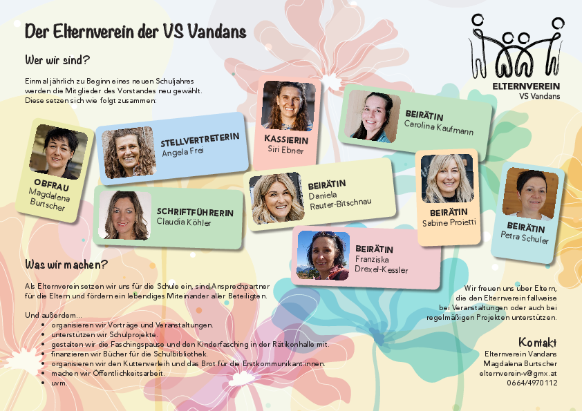 Die Volksschule Vandans wird schon seit mehr als 40 Jahren seitens des Elternvereins unterstützt. In vielen Belangen ist der Elternverein ein verlässlicher Partner, der das Schulleben aktiv mitgestaltet. Wir freuen uns über die vielfältige Unterstützung und die Aktionen des Elternvereins!